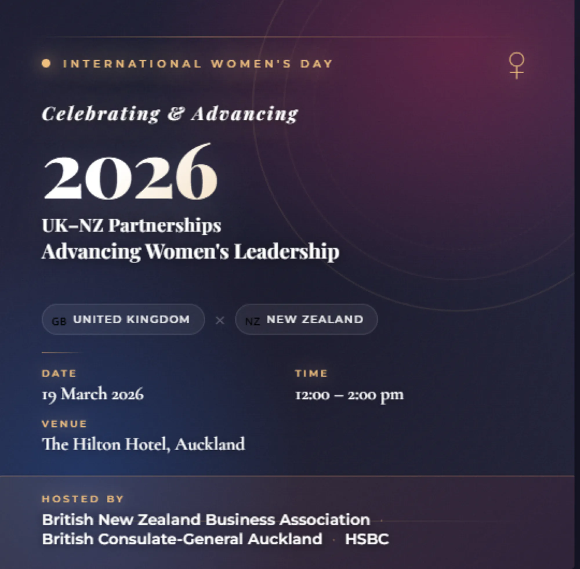 Hosted by the British New Zealand Business Association (BNZBA), the British Consulate-General Auckland and HSBC, this event brings together senior leaders, innovators, and decision‑makers to explore how the UK–NZ relationship is advancing women's economic empowerment across business, trade, and innovation.